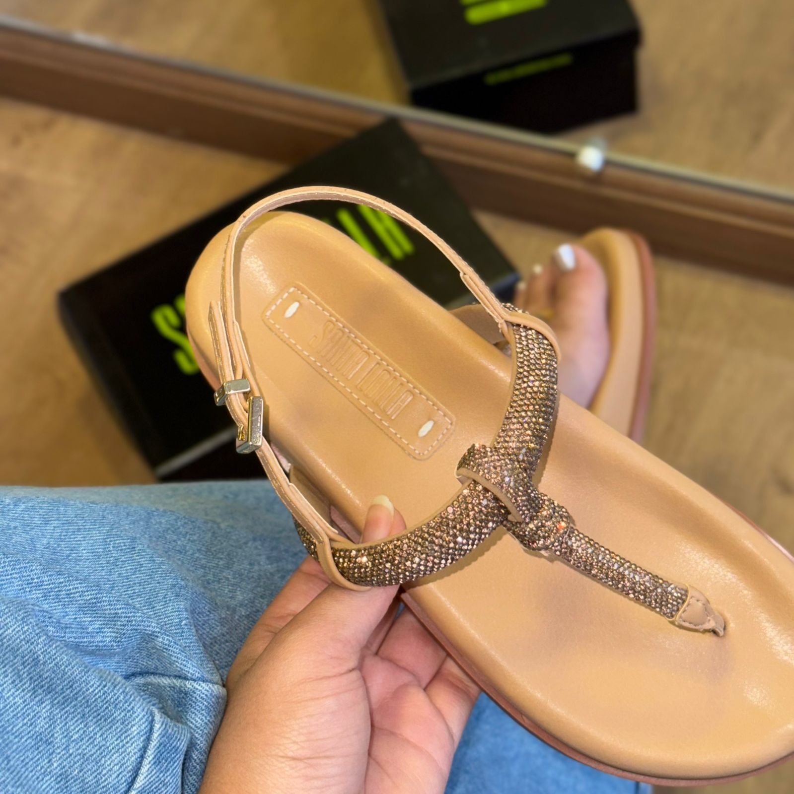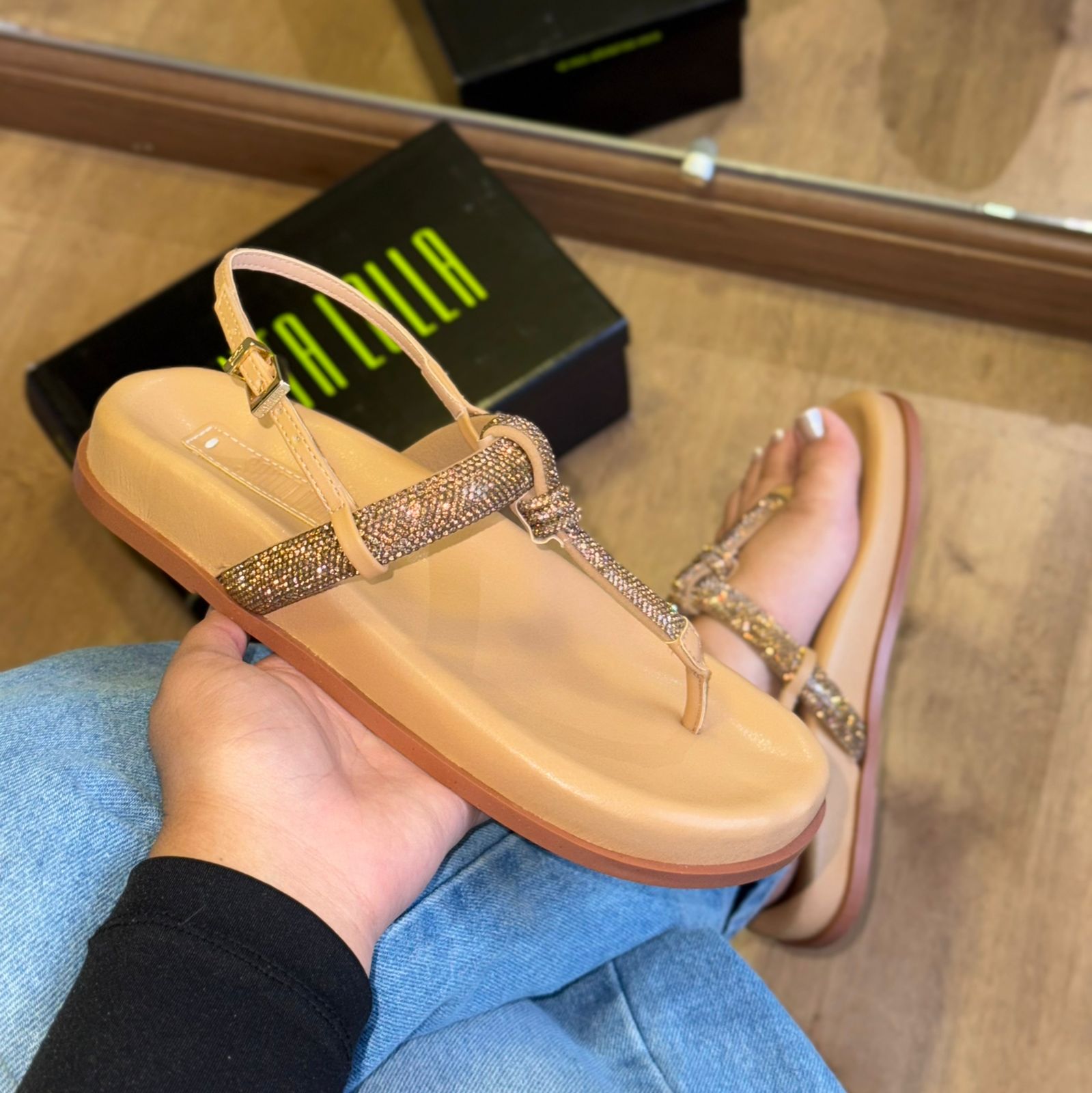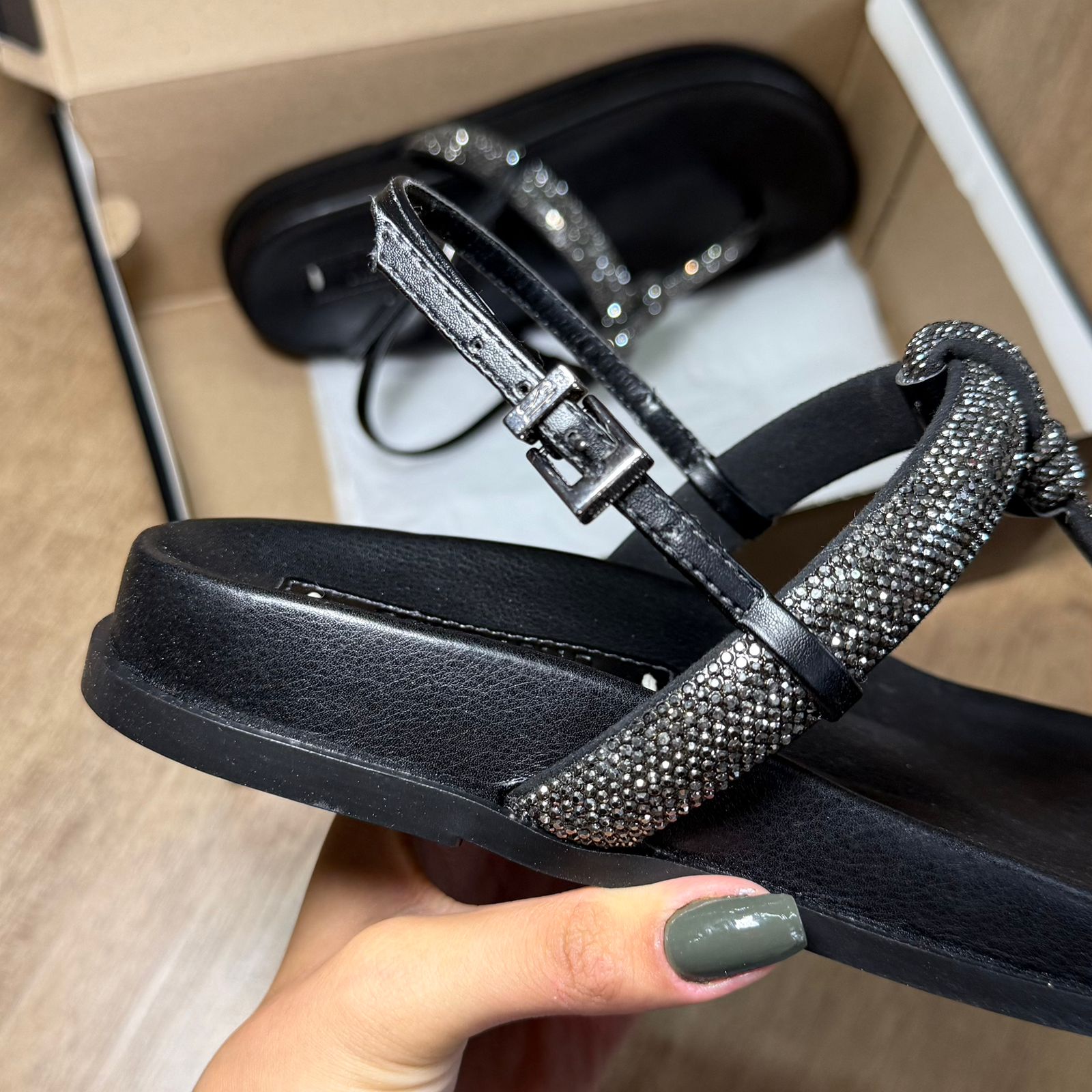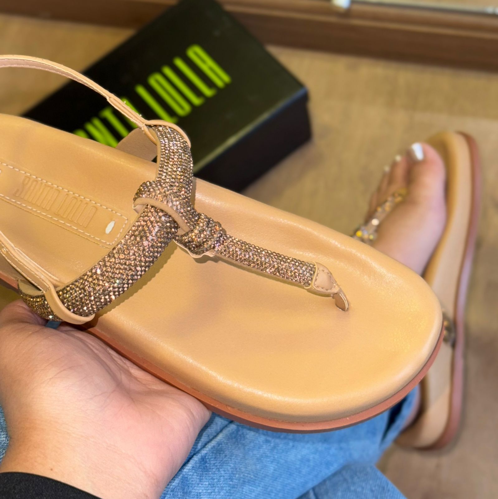 A Sandália Papete Santa Lolla é o equilíbrio perfeito entre conforto e glamour. Com design moderno e tiras adornadas com strass reluzentes, ela transforma qualquer look com um toque de elegância e brilho na medida certa.
