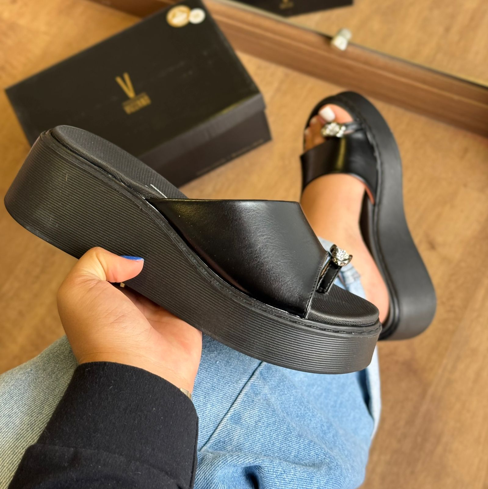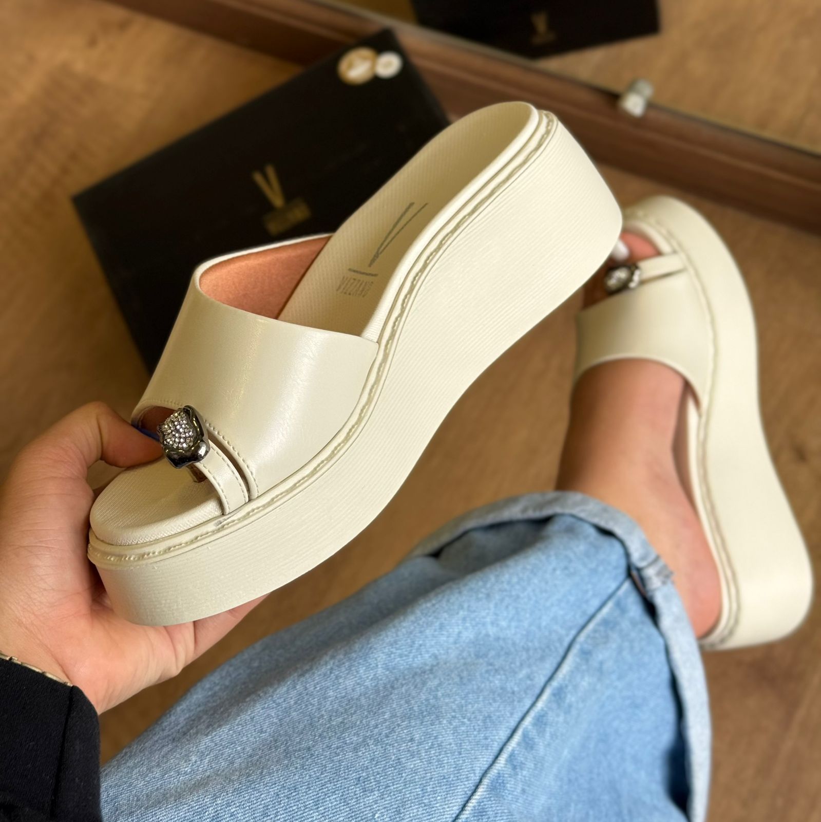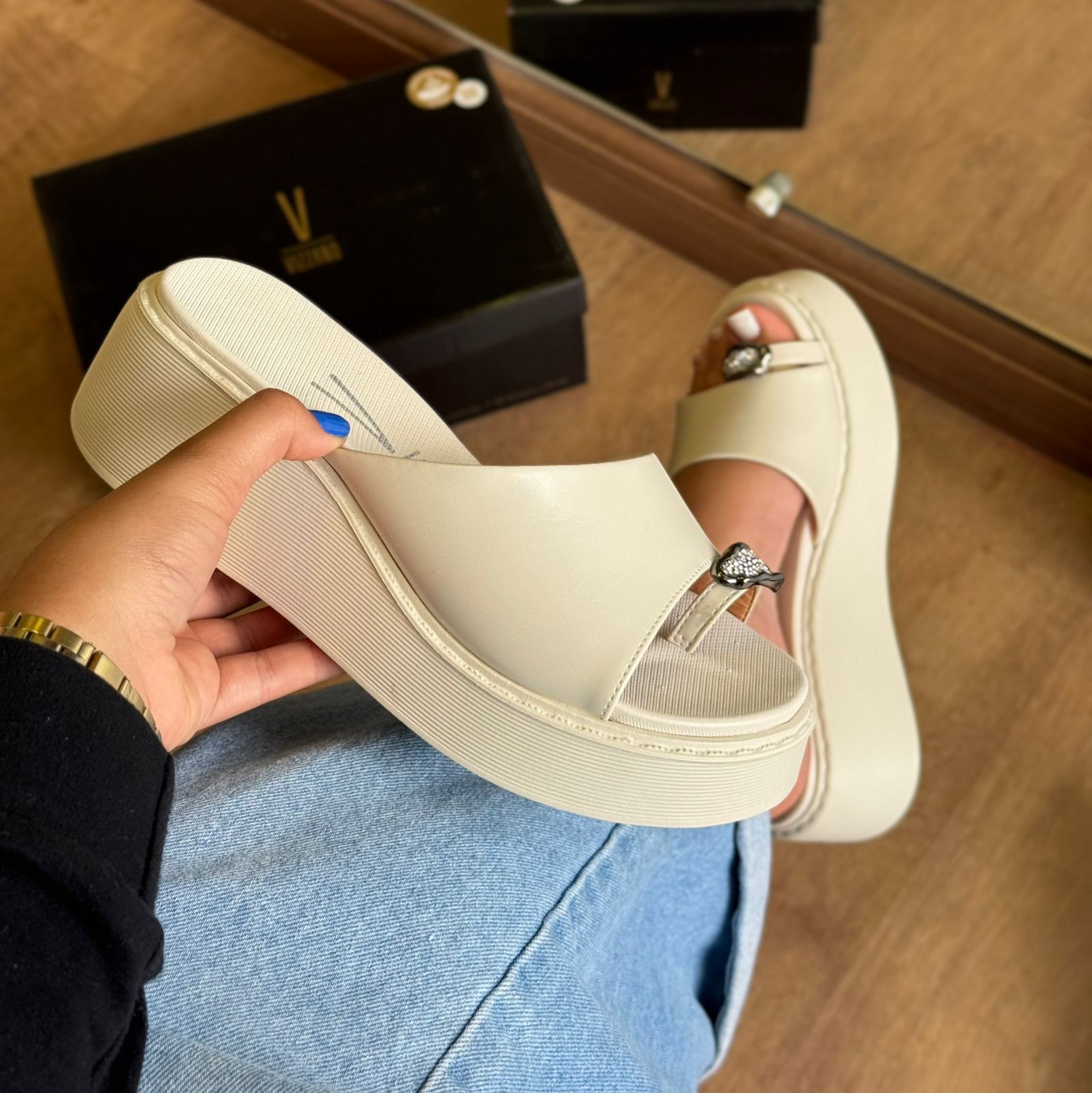 O modelo conta com salto anabela que oferece mais estabilidade ao caminhar, além de proporcionar um leve aumento de altura sem abrir mão do conforto. A palmilha macia garante uma sensação agradável durante o uso, enquanto o solado emborrachado ajuda a proporcionar maior segurança e aderência ao caminhar.