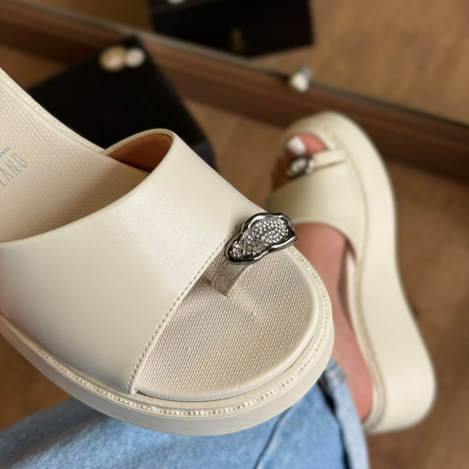 A sandália tamanco anabela dedeira na cor prata é perfeita para quem busca unir elegância e conforto no dia a dia. Seu design moderno e sofisticado valoriza os pés e combina facilmente com diferentes looks, desde produções casuais até composições mais estilosas para passeios e eventos informais.