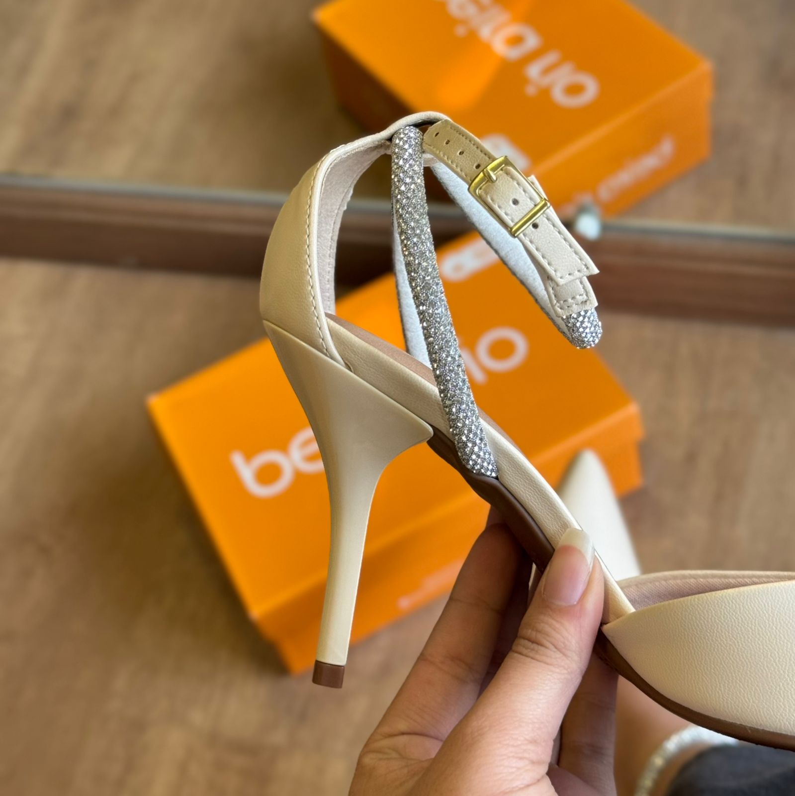 Scarpin elegante com bico fino, salto fino alto e tira delicada no tornozelo com aplicação de strass, proporcionando um toque sofisticado e moderno. Ideal para compor looks refinados para festas, eventos e ocasiões especiais.