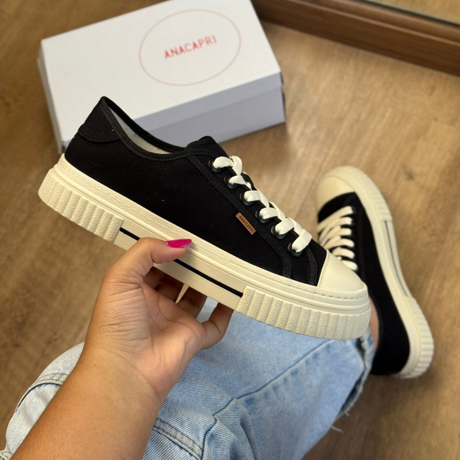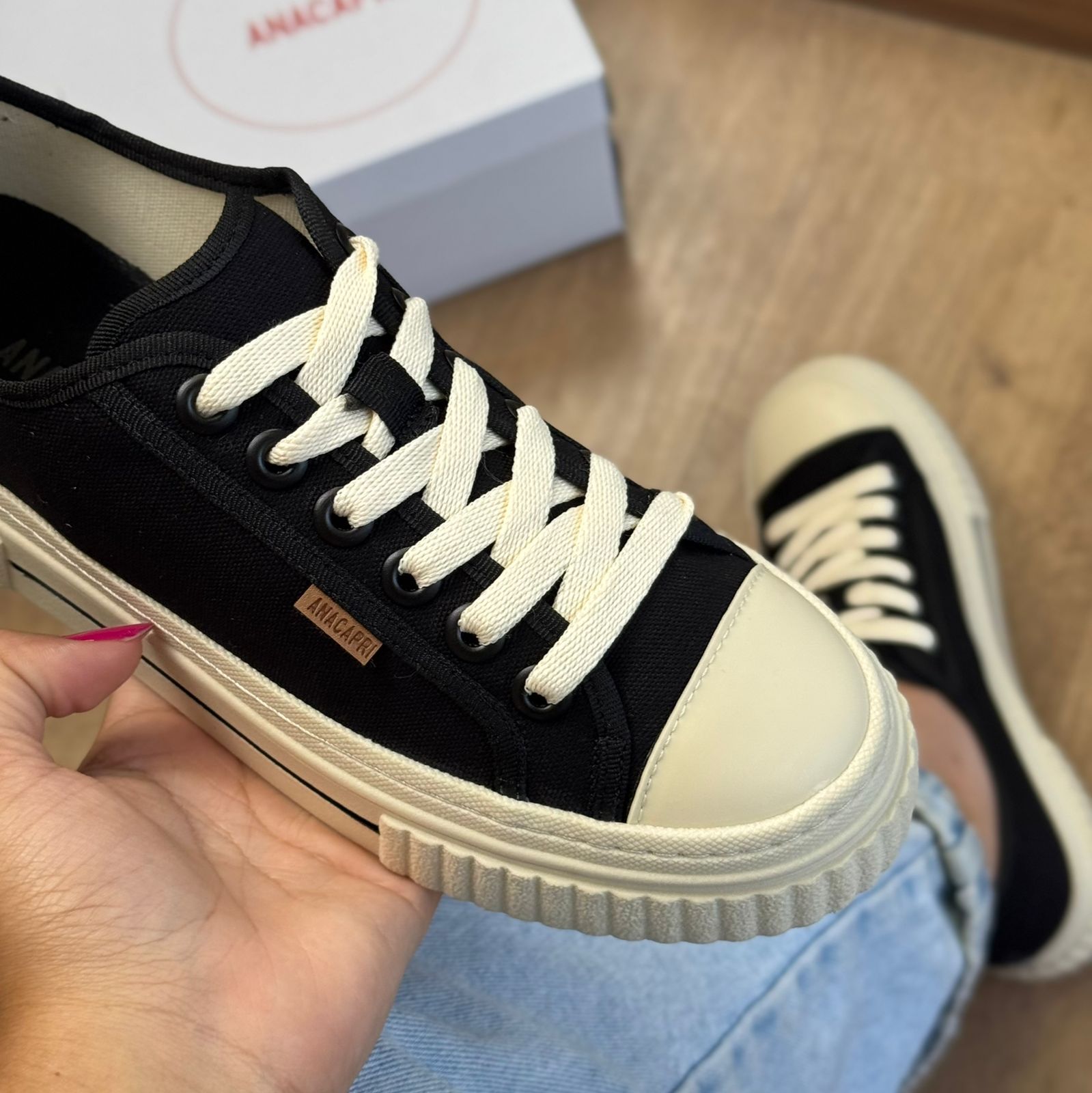 Tênis Sola Alta New Alê Lona Preto. O tênis Anacapri de amarração vem para a temporada de inverno com cabedal em tecido de lona colorida. Com atacadores brancos e ilhoses coloridos de mesmo tom do tênis, o modelo apresenta solado alto emborrachado e texturizado na biqueira e parte traseira, com detalhe em listra preta na lateral. Com aplicação de tag marrom Anacapri lateral. Contorno em fita e detalhe em aplicação de peça na parte traseira.