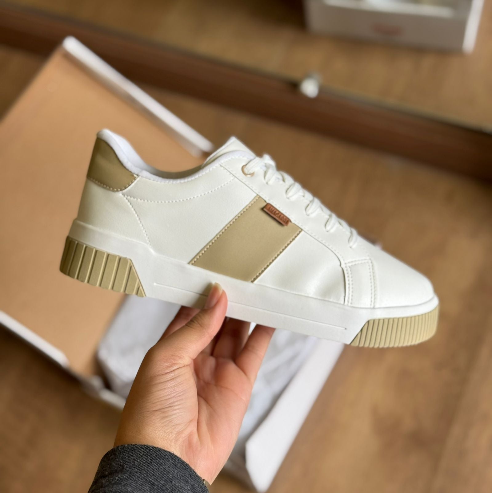 O modelo possui solado alto emborrachado branco, com detalhe em listra vazada na lateral e em preto na parte texturizada da biqueira e traseira. Com design de recortes, traz aplicação de peças em preto na parte superior do calcanhar e faixa larga em diagonal, na lateral do tênis. Apresenta costura pespontada por todo o cabedal, com amarração por atacadores. Traz tag marrom Anacapri lateral.