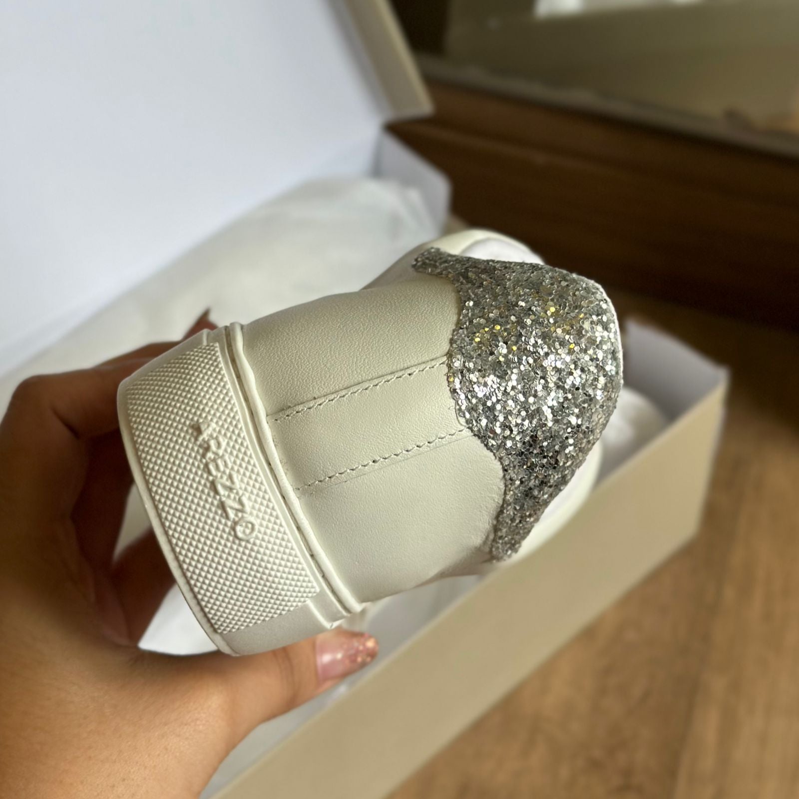 Descrição: O modelo de amarração tem solado baixo emborrachado branco, com frente e traseira texturizadas e base tratorada. Traz aplicação de brilhos prata no calcanhar. De bico redondo, o tênis tem fecho em cadarços brancos e gravação do nome da marca na lateral do cabedal.