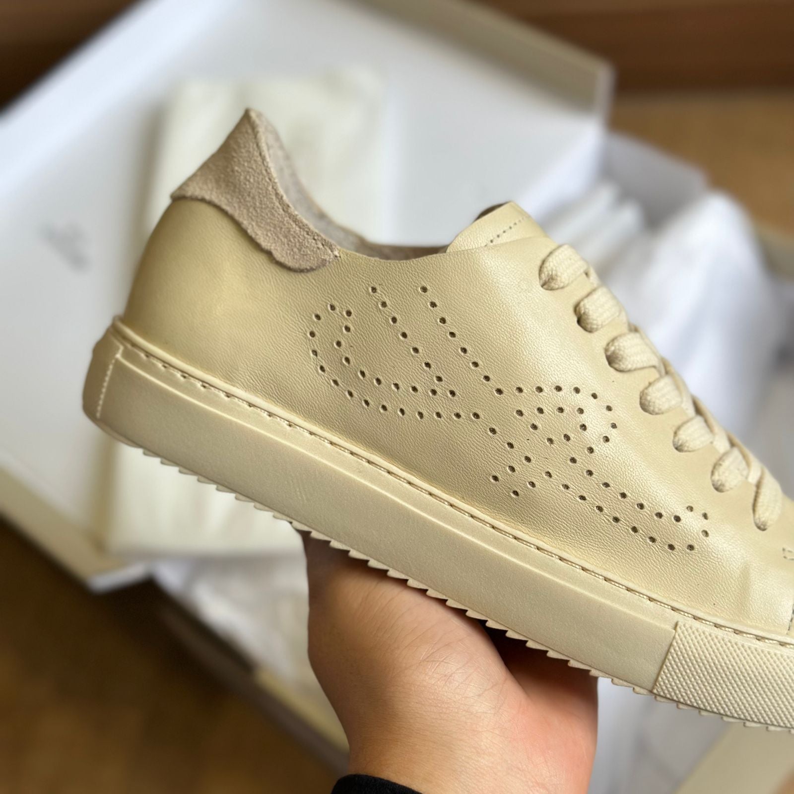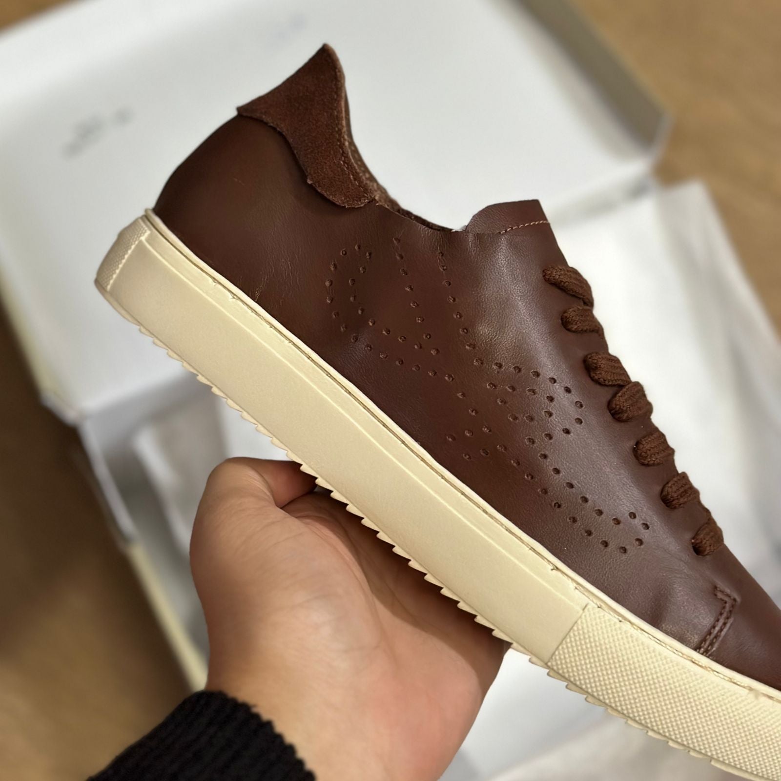 Descrição: O sapato tem solado baixo emborrachado branco. Traz aplicação em camurça no calcanhar e perfuração em forma de A na lateral. Com formato arredondado na ponta, o tênis tem fecho em cadarços da cor do calçado e tag do nome da marca na língua.