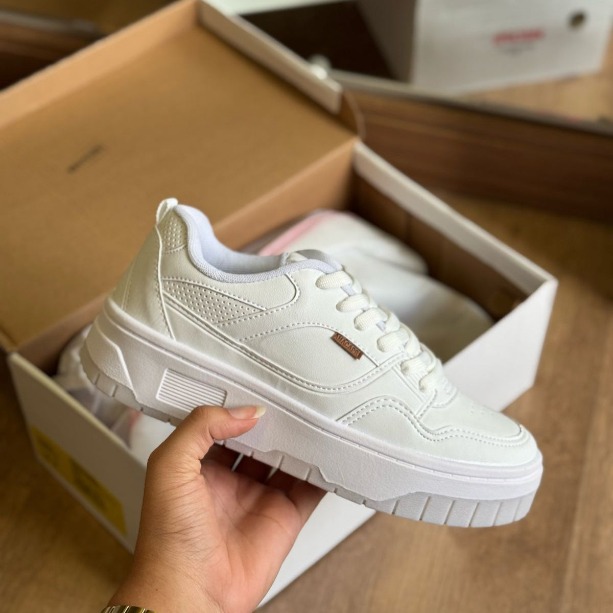 O modelo apresenta nova construção no solado - mais alto e estruturado, traz sola flatform emborrachada em branco com detalhe lateral e tratorada. Com um design robusto com aplicação de peças recortadas por todo o cabedal, traz acabamentos em costura pesponto nos contornos e perfuros no tecido, proporcionando maior respirabilidade para o tênis. De amarrar, com atacadores brancos. Aplicação de tag marrom lateral com assinatura Anacapri.