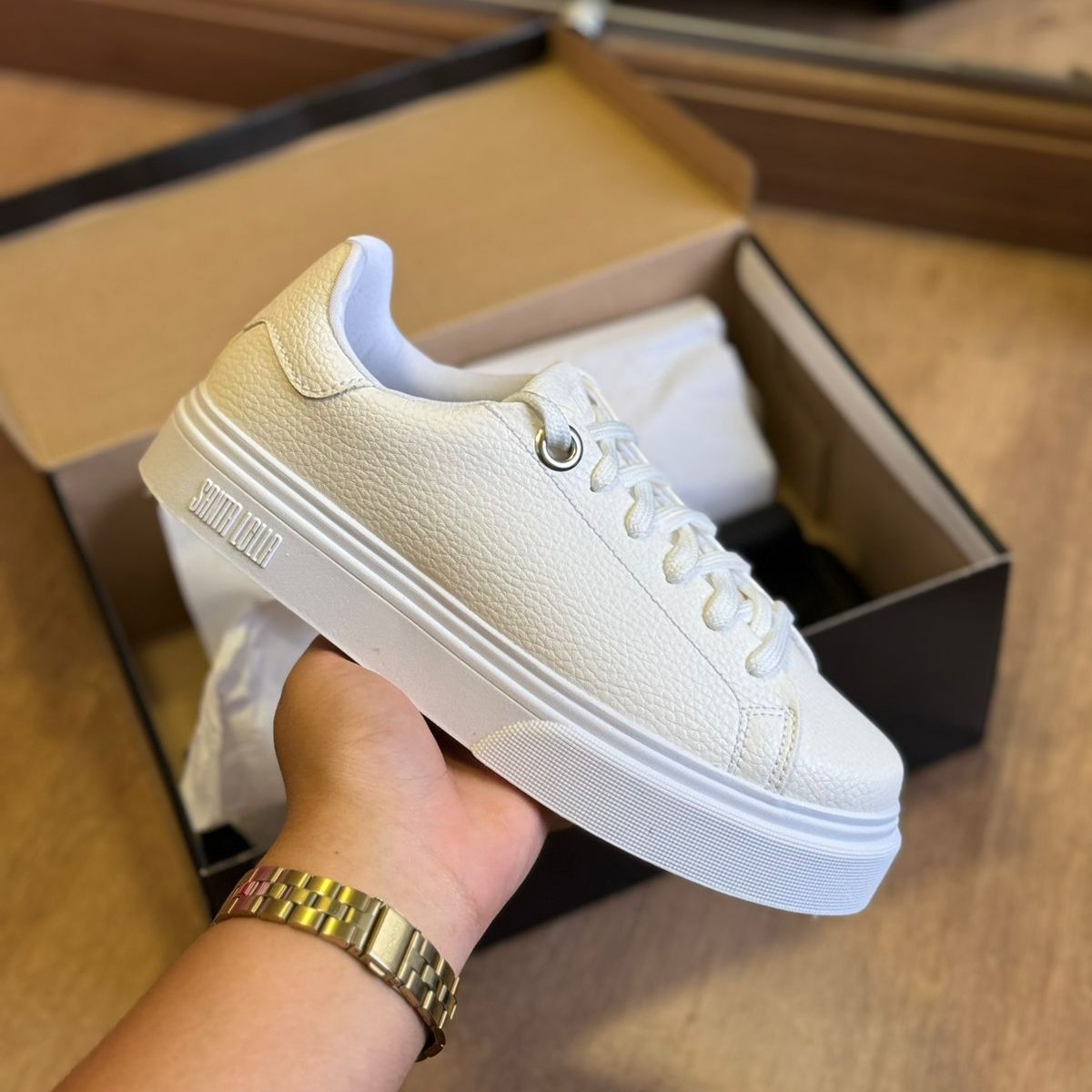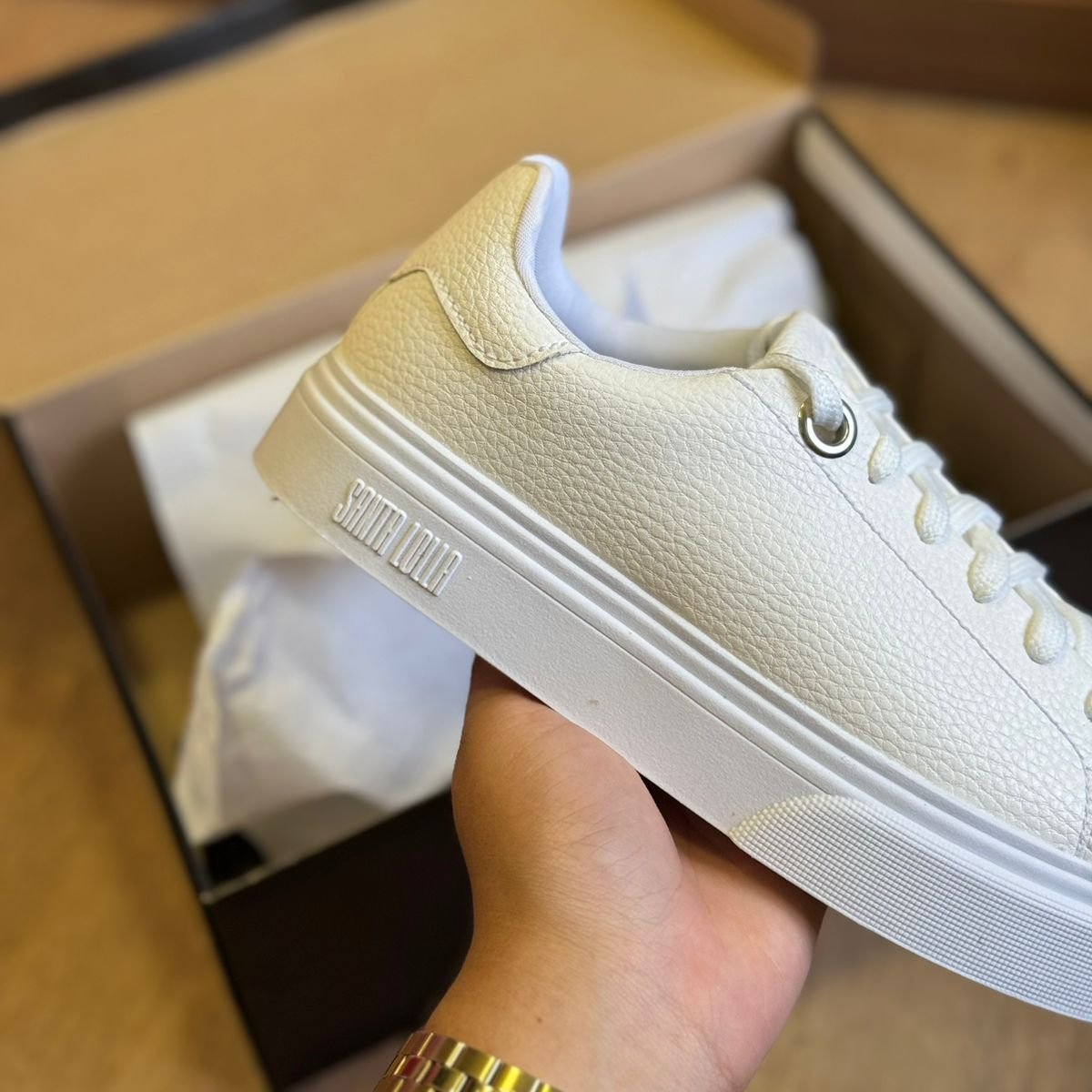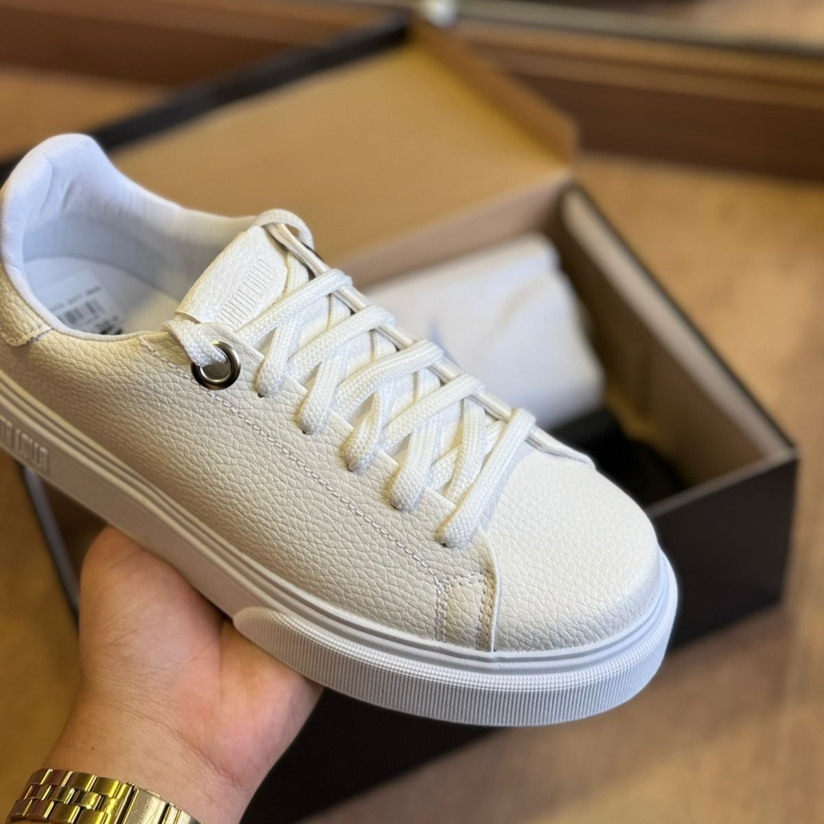 Possui fechamento em cadarço, bico redondo e solado flat. É uma escolha versátil e elegante para diversas ocasiões. Esse tipo de tênis é ideal tanto para combinações mais casuais, como jeans e camiseta, quanto para looks mais alinhados, como vestidos ou peças de alfaiataria. Por ser branco, ele se torna um item curinga no guarda-roupa, fácil de combinar e capaz de trazer leveza e modernidade ao visual.