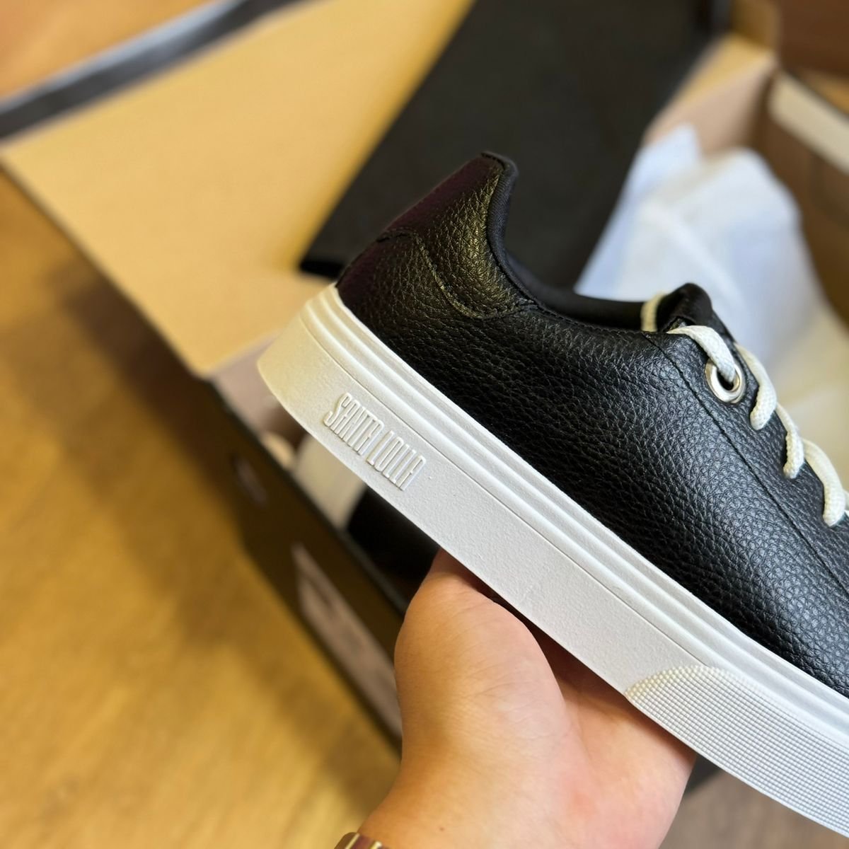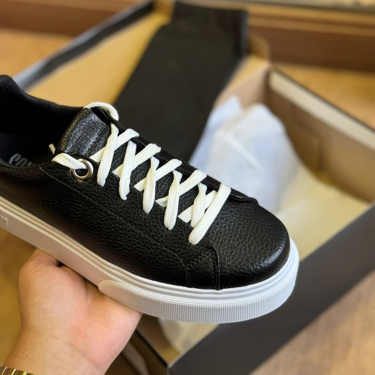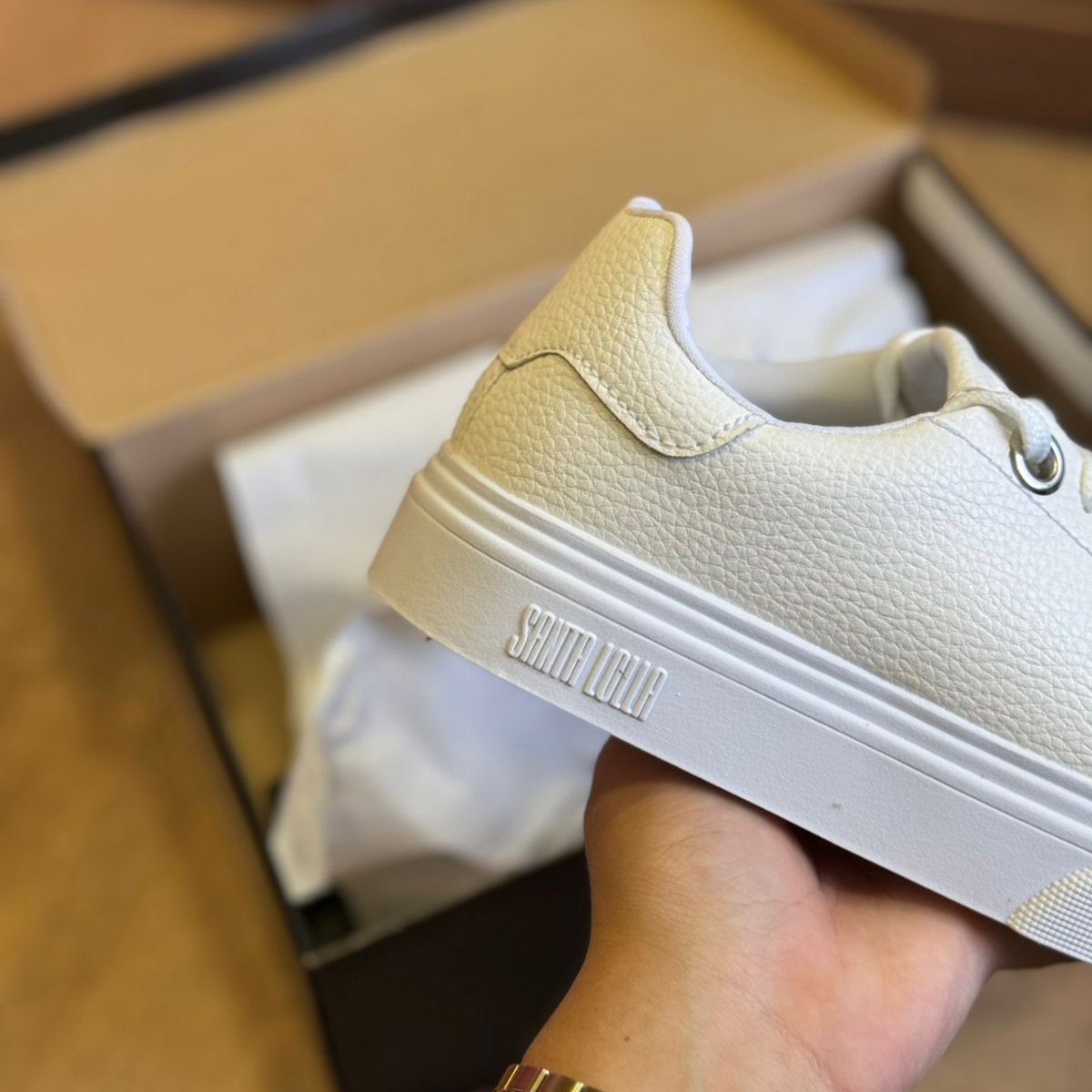 Possui fechamento em cadarço, bico redondo e solado flat. É uma escolha versátil e elegante para diversas ocasiões. Esse tipo de tênis é ideal tanto para combinações mais casuais, como jeans e camiseta, quanto para looks mais alinhados, como vestidos ou peças de alfaiataria. Por ser branco, ele se torna um item curinga no guarda-roupa, fácil de combinar e capaz de trazer leveza e modernidade ao visual.